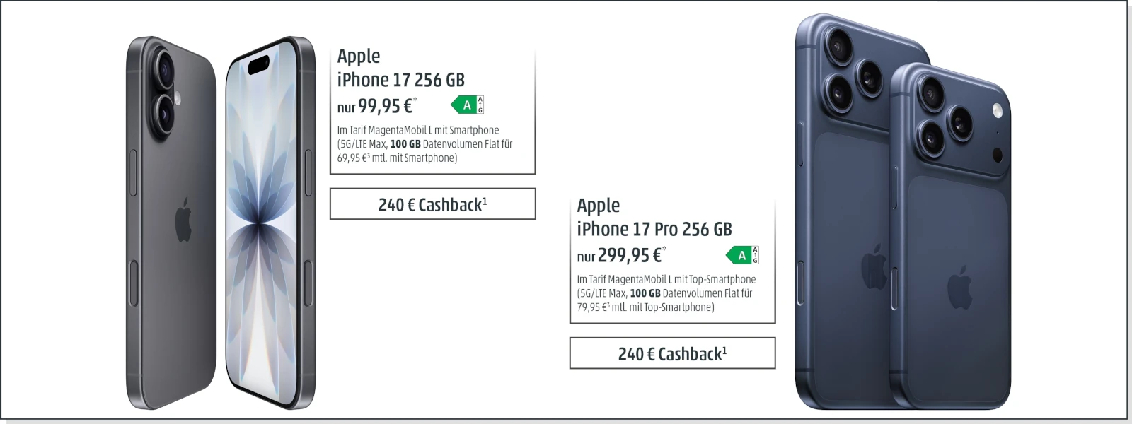 1) Im Aktionszeitraum 05.12.2025 bis einschließlich 02.02.2026 erhalten Kunden bei Abschluss eines neuen Mobilfunk-Vertrags mit einer Mindestvertragslaufzeit von 24 Monaten in den Tarifen MagentaMobil XS und S mit oder ohne Endgerät einen Cashback in Höhe von 120 € sowie in den Tarifen MagentaMobil M, L und XL mit oder ohne Endgerät einen Cashback in Höhe von 240 € gutgeschrieben (ausgeschlossen sind PlusKarten Tarife inkl. PlusKarte+, PlusKarte Kids & Teens und PlusKarte Data, Young Tarife, Special Tarife, DTAG-Tarife, for Friends Tarife und Datentarife). Z. B. MagentaMobil S für 39,95 €/Monat, einmaliger Bereitstellungspreis 39,95 €. Die Gutschrift ist nicht mit weiteren Aktionspromotions wie z. B. 6 Monate Grundpreisbefreiung kombinierbar. Zum Erhalt der Gutschrift (nach Ablauf der Widerrufsfrist) ist vom 01.01.–31.07.2026 eine Online-Registrierung über die MeinMagenta App (mit Klick auf Ihr Profil, „Cashback einlösen“) unter Vorlage der ersten Rechnung entsprechend den genannten Bedingungen erforderlich.